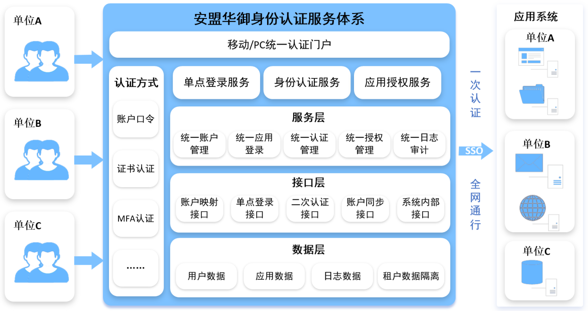 安盟华御PaaS化身份认证服务,采用云原生技术架构,依托公司密码服务平台,为用户提供基于密码技术的强身份认证能力,帮助应用系统满足等级保护和密码应用测评的身份鉴别要求。平台基于数字证书,采用统一的数字化身份信息,实现访问用户身份的统一认证,帮助政企单位实现统一用户管理、统一应用登录、统一认证管理、统一授权管理和统一日志审计,解决云上应用系统用户分散管理、独立认证、多次登录等问题。