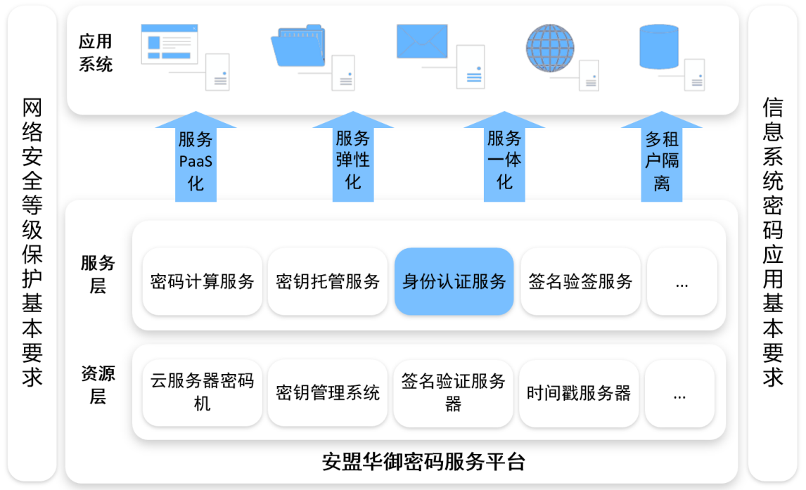 安盟华御PaaS化身份认证服务基于密码服务平台为政企单位提供强身份认证能力。具备以下特色: